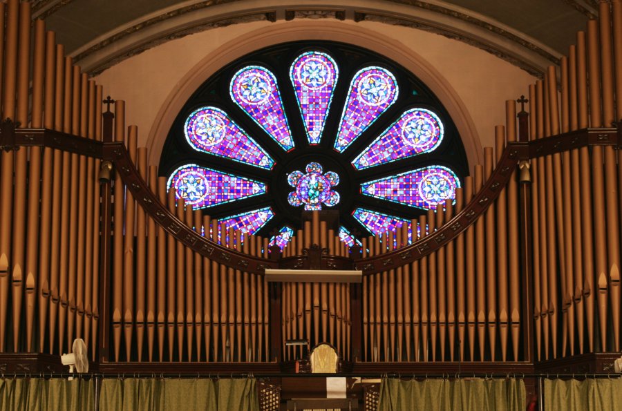 The organ, which is encased in solid mahogany, was installed by the Moeller Company of Hagerstown, Maryland. When built, it was said to be the largest in any catholic or non-catholic church. It was designed by Firmin Swinnen, a private concert organist for Pierre S. Du Pont and a graduate of the Royal Conservatory of Music in Antwerp, Belgium. For those who are interested in organs, this particular one has 3 manuals, 61 stops, 25 couplers, 25 pistons, 3 separate swell boxes and 3,000 pipes. We were in the progress of refurbishing the organ, but this project is now on haitus because of extensive cost. In keeping with the tradition of Holy Rosary, the new Viscont electronic organ is also from Italy.