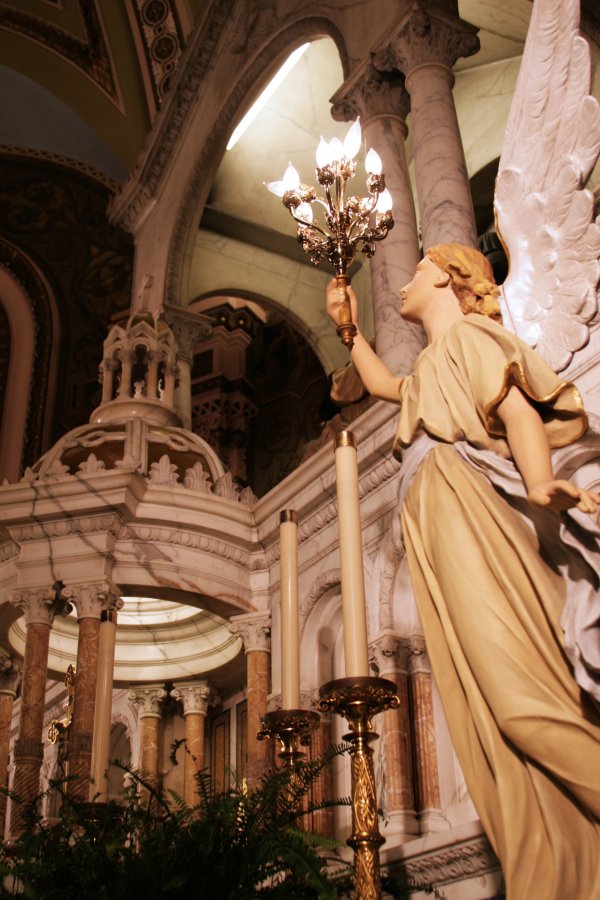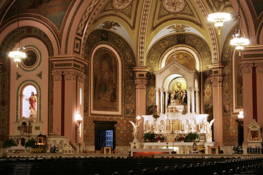 The building is of Romanesque design and is constructed of woodstock granite. The church has a seating capacity of 2,000 people. It was featured in architectural magazines of the day because of the steel arches used in the ceiling which allowed for no pillars to hold up the roof, making the marble-carved altar the main focus of attention. The only pillars used in the church are the ones to support the choir loft. The grand altars were made of 49 tons of Italian and Spanish marble in Pietrasanta, Italy and then transported to Baltimore. The main altar is 20 feet wide and 30 feet high. The mosaics in the church are all of Venetian work. The original statuary of the church--the Rosary Group, St. Joseph, and the Sacred Heart of Jesus--came from Spain and were designed using the most sophisticated European artistry of the time. Notice the great attention to detail, even to the glass eyes which give the statues a very real presence. The main group of statues above the high altar depicts the apparition of Our Lady of Pompeii (in Italy, on March 3, 1884) giving the rosary to St. Dominic while St Catherine looks upon Our Lady with great love.