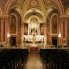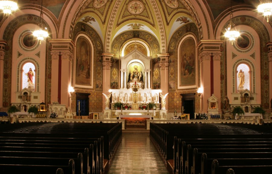 The building is of Romanesque design and is constructed of woodstock granite. The church has a seating capacity of 2,000 people. It was featured in architectural magazines of the day because of the steel arches used in the ceiling which allowed for no pillars to hold up the roof, making the marble-carved altar the main focus of attention. The only pillars used in the church are the ones to support the choir loft. The grand altars were made of 49 tons of Italian and Spanish marble in Pietrasanta, Italy and then transported to Baltimore. The main altar is 20 feet wide and 30 feet high. The mosaics in the church are all of Venetian work. The original statuary of the church--the Rosary Group, St. Joseph, and the Sacred Heart of Jesus--came from Spain and were designed using the most sophisticated European artistry of the time. Notice the great attention to detail, even to the glass eyes which give the statues a very real presence. The main group of statues above the high altar depicts the apparition of Our Lady of Pompeii (in Italy, on March 3, 1884) giving the rosary to St. Dominic while St Catherine looks upon Our Lady with great love.