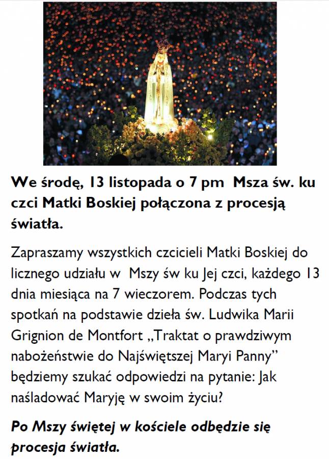 Msza św. ku czci Matki Bożej połączona z procesją światła. Msza ta odbywać się będzie w 13-ty dzień każdego miesiąca. 13 listopada 2013 odbyło się takie nabożeństwo po raz pierwszy.